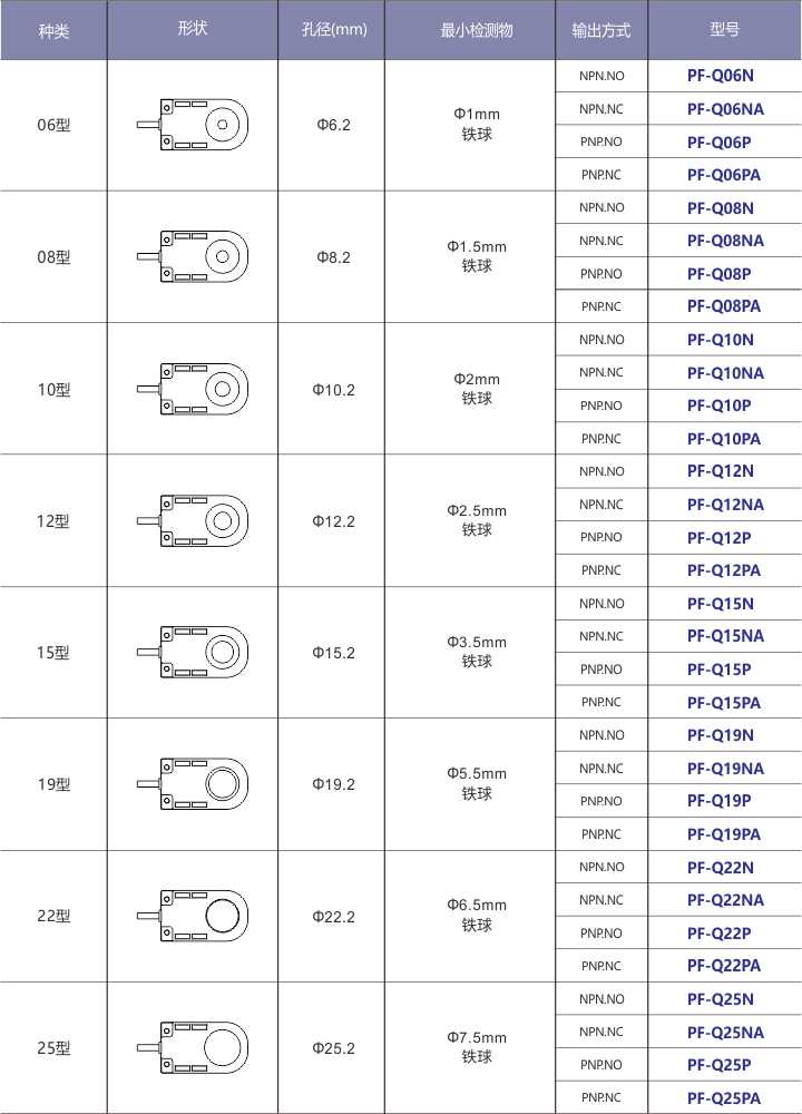 ECOTTER環型接近開關有多種規格可選,孔徑分別有6.2、8.2、10.2、12.2、15.2、19.2、22.2、25.2mm直徑,NPN\PNP開關量信號可選。