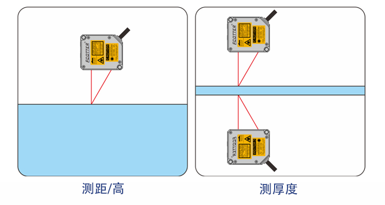 測距、測高是比較簡單的應用,傳感器輸出的數據可以直接使用,測厚則需要進行計算,將兩個激光傳感器在固定的距離L進行安裝,讀取兩個距離A和B,厚度H=L-A-B。