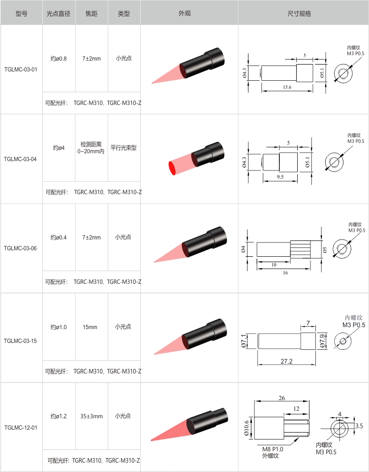 適用于M3反射光纖的聚光鏡有焦距7±2mm的、15mm的和35±3mm的,還有把光折射90度再聚焦的。