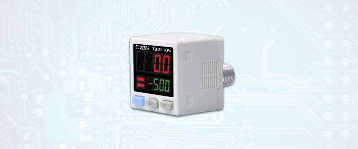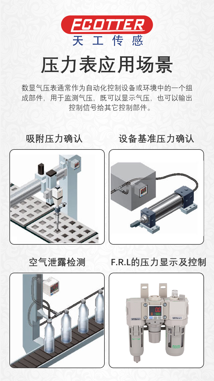 ECOTTER數顯壓力表監測氣壓之余,可以根據設定值輸出信號,如在吸附確認的應用中,吸到物料和沒吸到物料的時候會有明顯的區別,氣壓表就可以設置在不同的氣壓輸出信號。