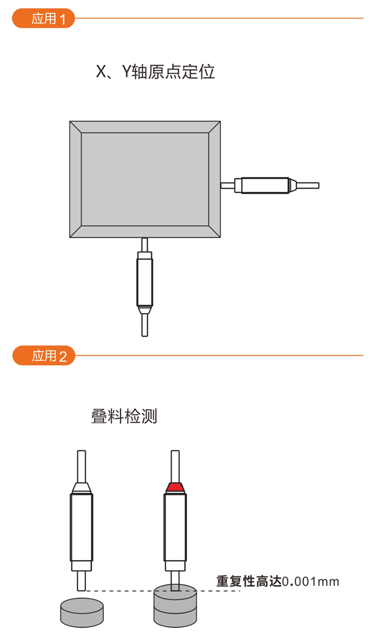如X\Y軸定位,在物體運(yùn)動(dòng)的X/Y軸上安裝該傳感器,當(dāng)物體朝軸方向運(yùn)動(dòng),按壓到傳感器后在觸發(fā)信號(hào)的位置輸出信號(hào),再控制物體停止或做其他動(dòng)作。