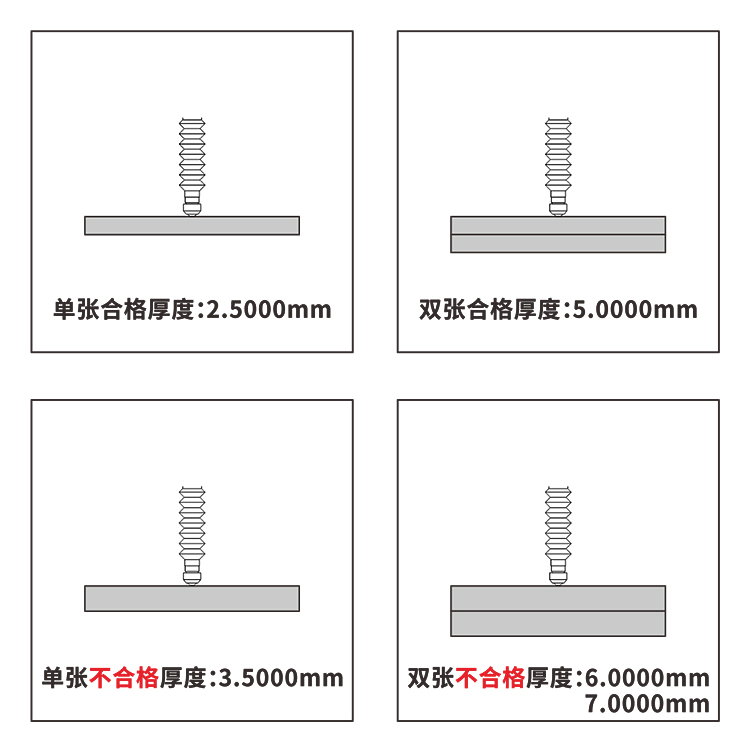 在檢測來料厚度時,合格料的厚度大概為2.5mm,不合格料大概為3.5mm,誤差不超過0.1mm,精度要求不高,而ECOTTER接觸位移傳感器的檢測精度可以達到0.5um,并且支持動態(tài)測量。設(shè)定合格尺寸2.5±0.1mm、5.0±0.1mm,不合格尺寸3.5±0.1、6.0±0.1mm、7.0±0.1mm實現(xiàn)剔除。