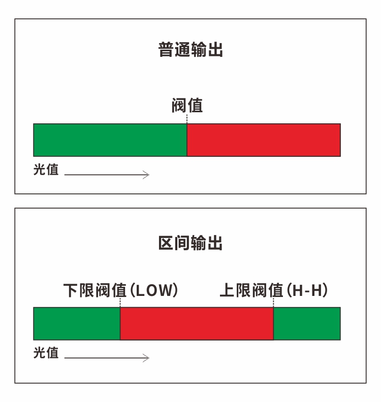 光纖放大器普通的檢測輸出方式是設置閥值,光值大于或小于閥值輸出信號,檢測有無。而FG-40-H的區間輸出功能可以選取光值區間的中間部分輸出,功能更豐富,可以應對更復雜的場景。