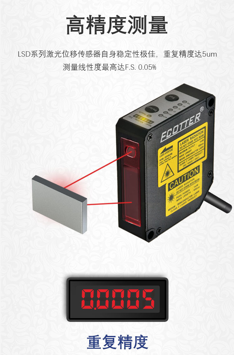 ECOTTER 激光位移傳感器LSD系列可精確非接觸測量被測物體的位置、位移等變化,主要應用于檢測物體的位移、厚度、振動、距離、直徑等幾何量的測量。
