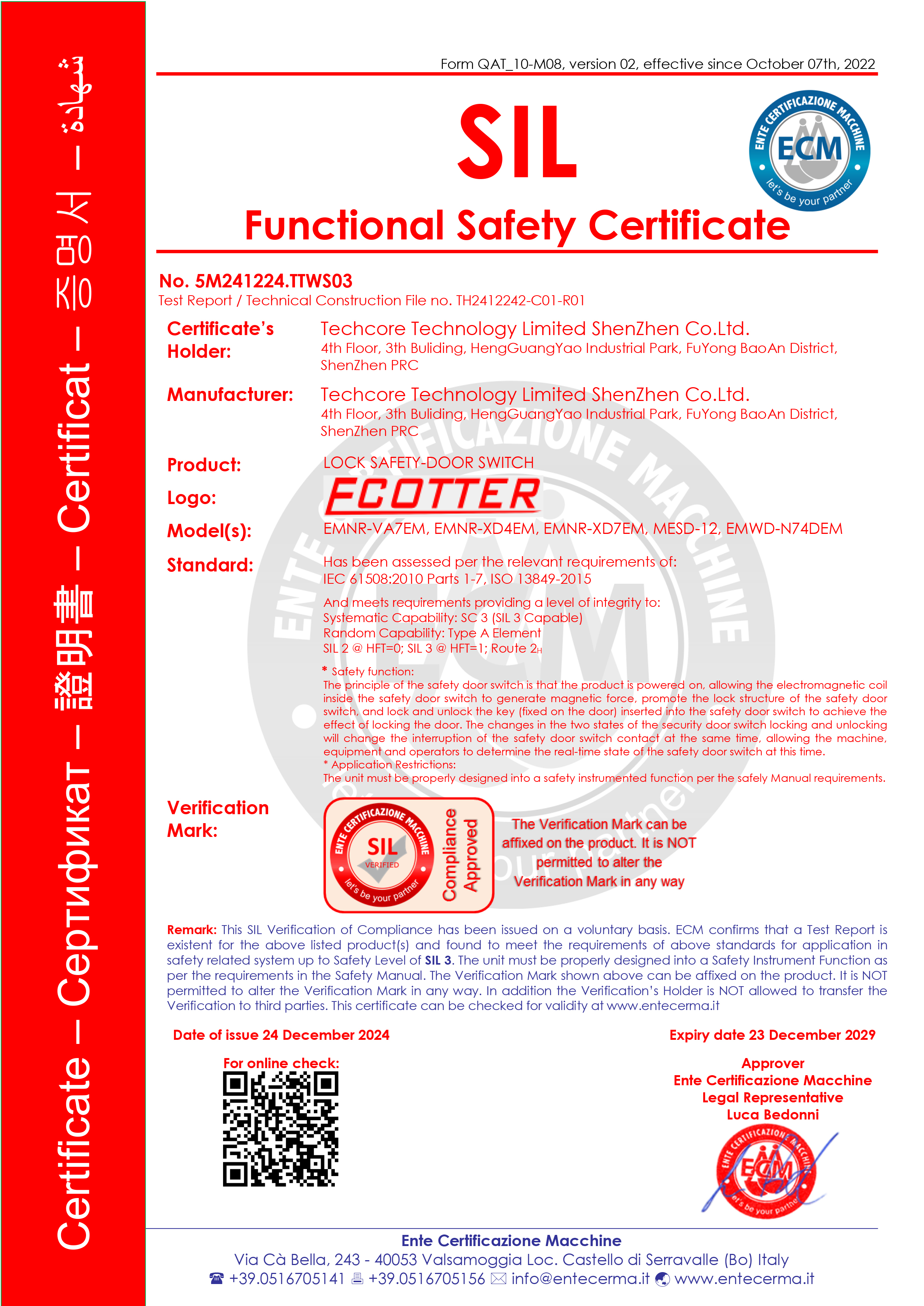 ECOTTER 安全門鎖 強制鎖定力可達1300N,擁有防火阻燃材料做成的機身,銀鍍金防燒蝕的觸點,機械壽命百萬次,電氣壽命數十萬次,有SIL安全等級認證。