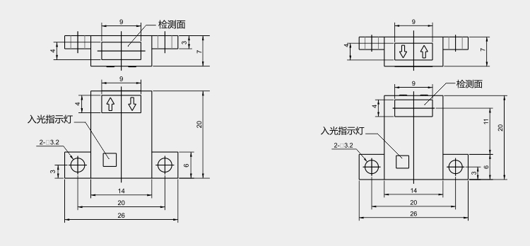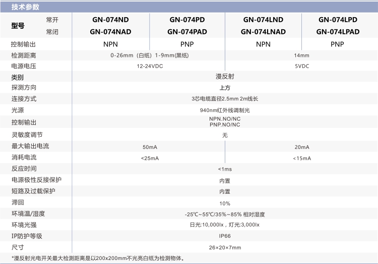 ECOTTER GN-07系列光電開關 提供了標準距離款與雙倍距離型號、上方檢測與前方檢測兩個檢測方向,可以根據不同的工況選擇對應的款式。