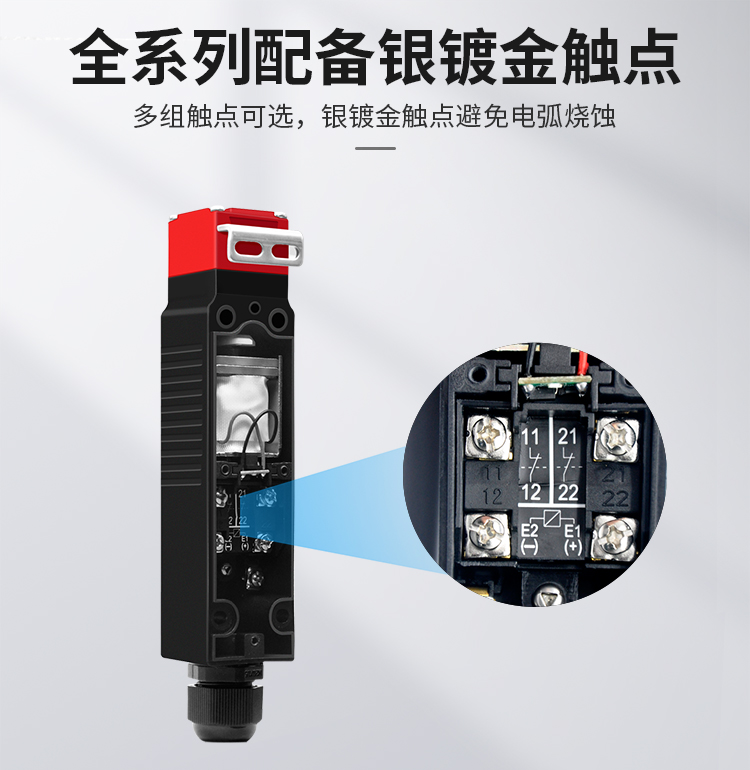 ECOTTER安全門鎖的鎖定力 強電磁式抗拉力強制鎖定力1300N以上。全系列標配復合銀鍍金觸點,避免電弧燒蝕,保證優秀導電性能。安全門開關外殼采用PA66阻燃材質,耐高溫;電纜接頭防水;抗撞擊可選配金屬鎖頭加強防沖擊能力。